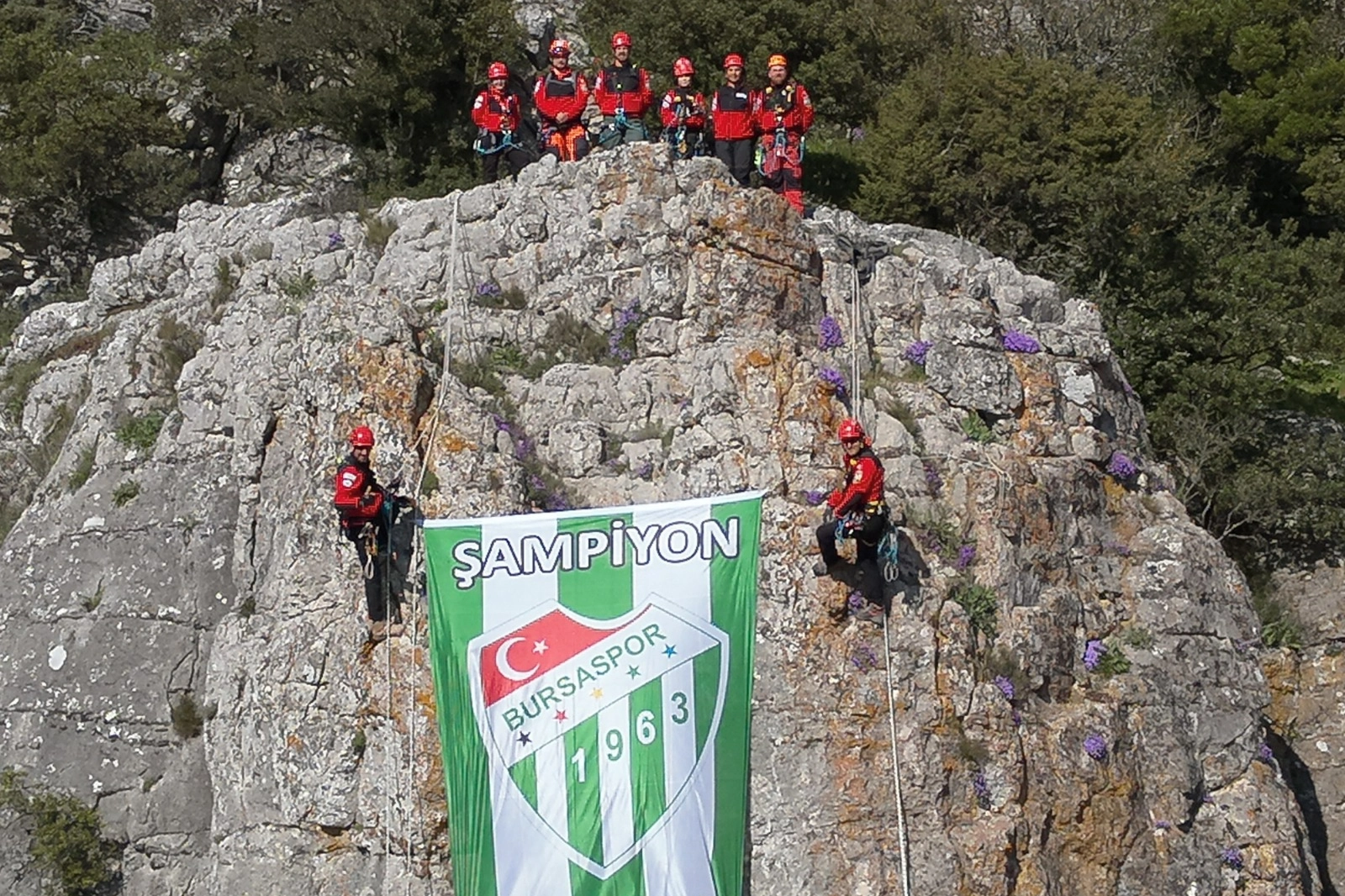 Tatbikatın ardından zirveye ulaşan ekipler, Bursaspor bayrağını açarak anlamlı bir mesaj verdi.